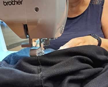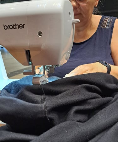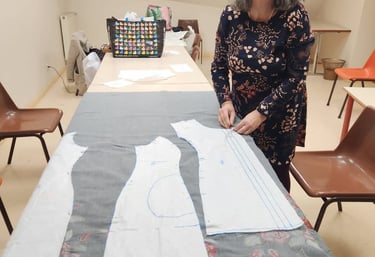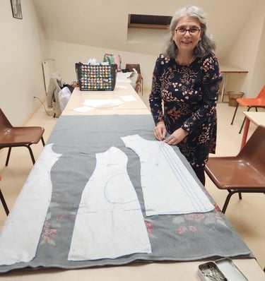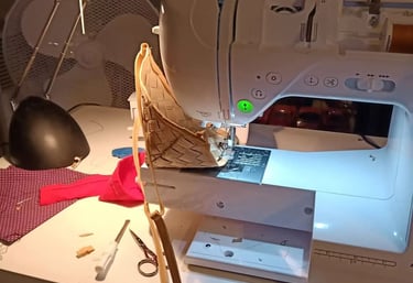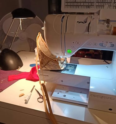 Toujours accompagnée de ma machine à coudre, j’ai peu à peu perfectionné mon savoir-faire jusqu’à ouvrir mon atelier à domicile, où je crée pour moi et pour les autres.